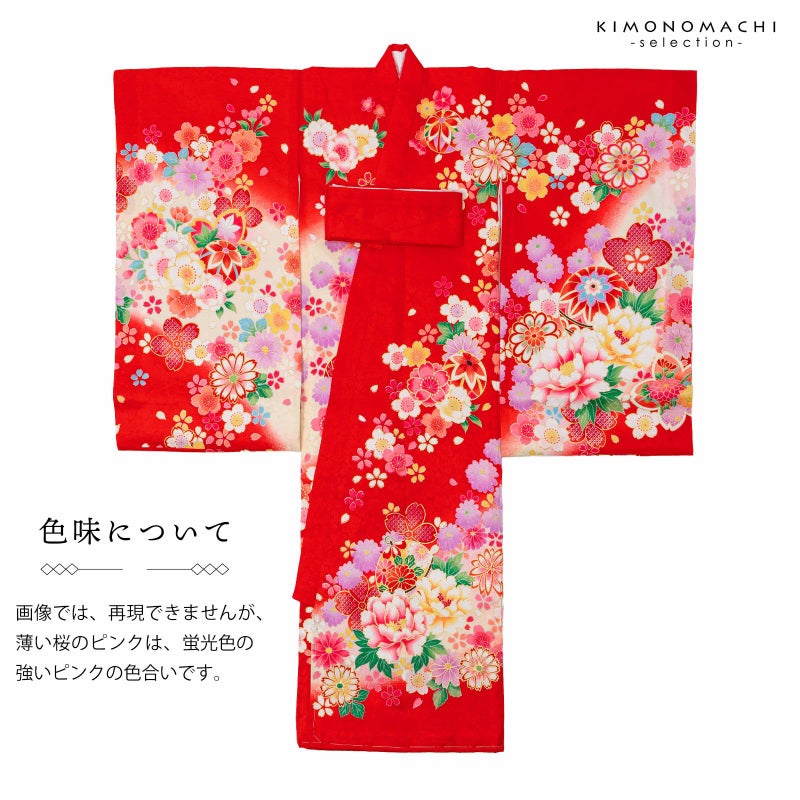 高級感がありつつも、女の子らしく可愛らしい雰囲気。美しい発色の生地に美しい模様。長襦袢の中に赤色の振りが入っており、華やかさをプラスしてくれます。細部に至るまで、こだわったお品です。