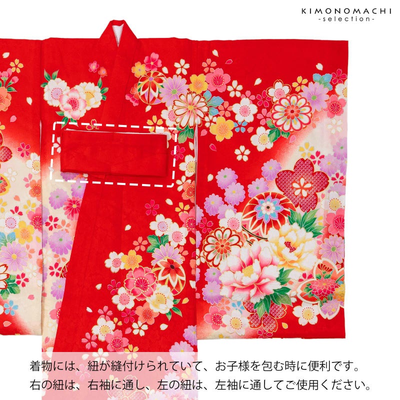 着物には紐が縫い付けられていて、お子様を包む時に便利です。右の紐は右袖に通し、左の紐は左袖に通してご使用ください。