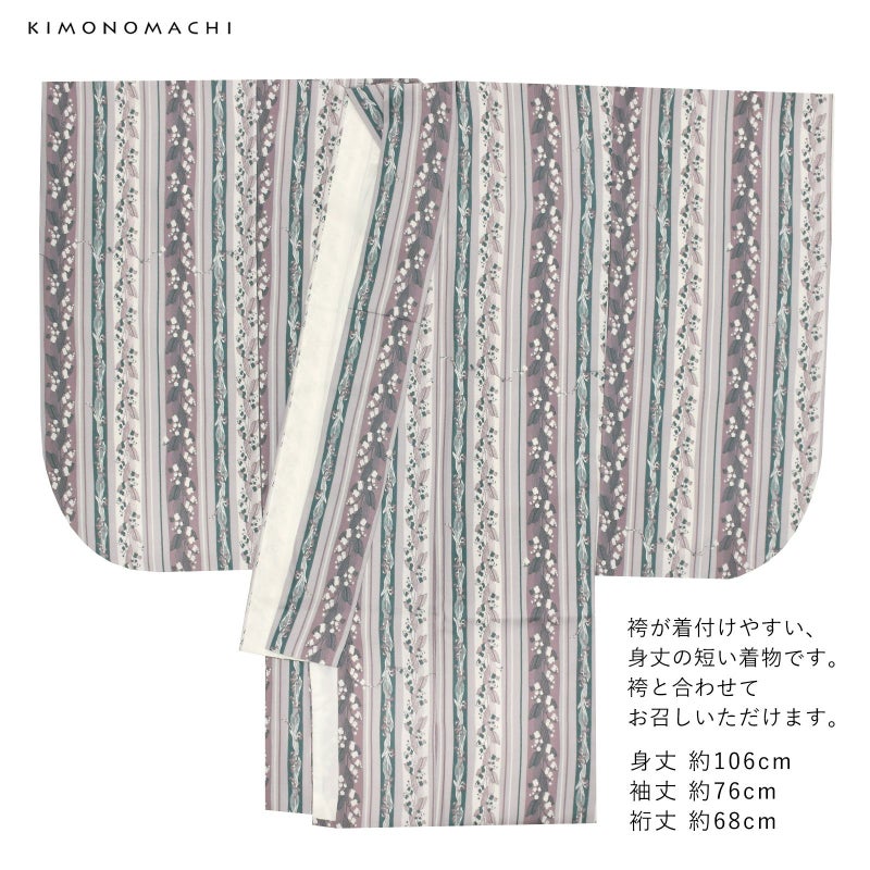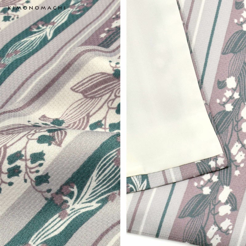 二尺袖着物:細かな地模様のある生地。淡いグレー地にオフホワイト、グレイッシュなパープルと青緑色の縦縞の中に、抽象的に表現された大小のスズランの連続模様が配置されています。かわいらしいスズランを更紗縞風に構成し、現代的な配色で大人っぽく仕上げたデザインです。裏地は白。