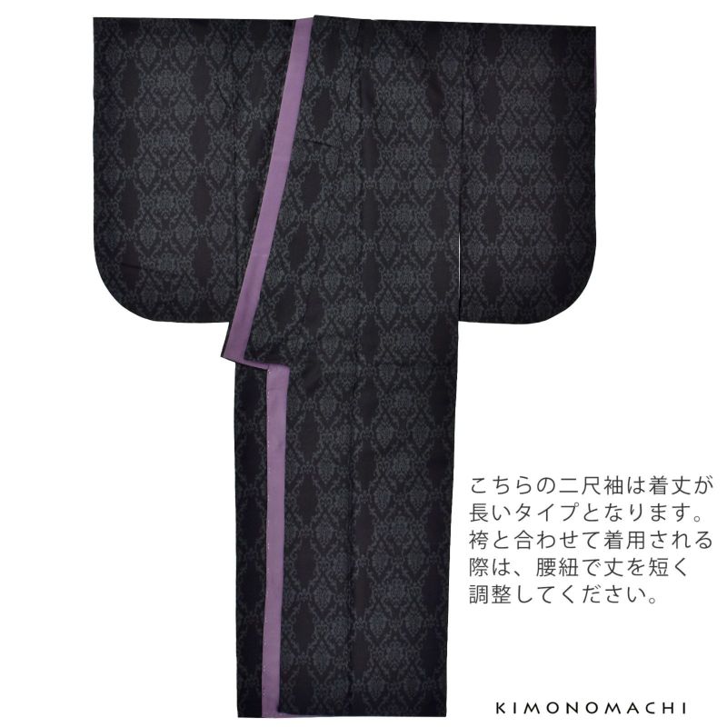 二尺袖着物:細かな地模様のある生地。黒地にグレーのアラベスク文様。菱形の唐花に立涌状に伸びる蔓草文様とモノトーンの配色が、華やかさとミステリアスな魅力を放つデザインです。裏地は紫。