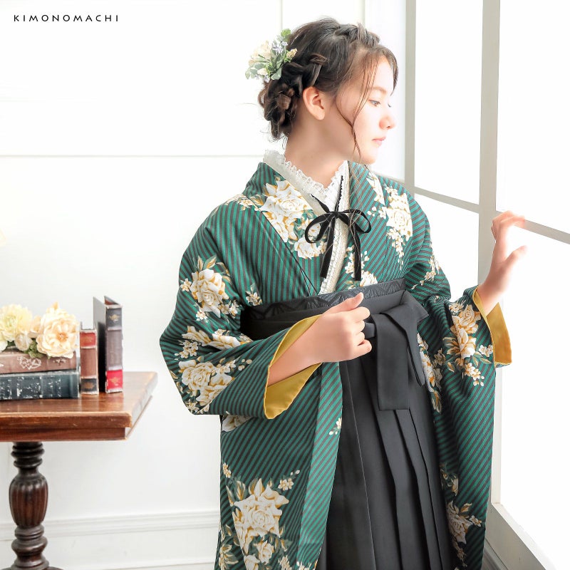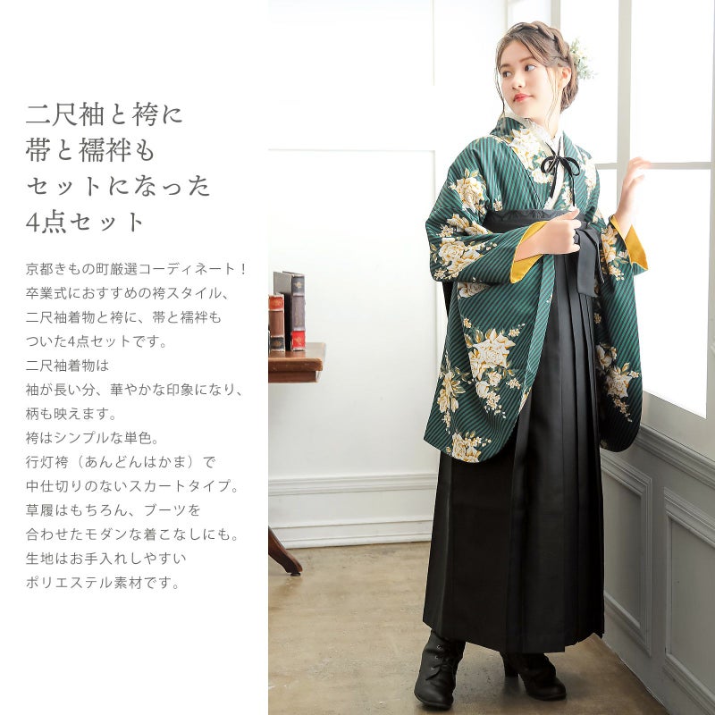 京都きもの町厳選コーディネート!卒業式におすすめの袴スタイル、二尺袖着物と袴に、帯と補袢もついた4点セットです。