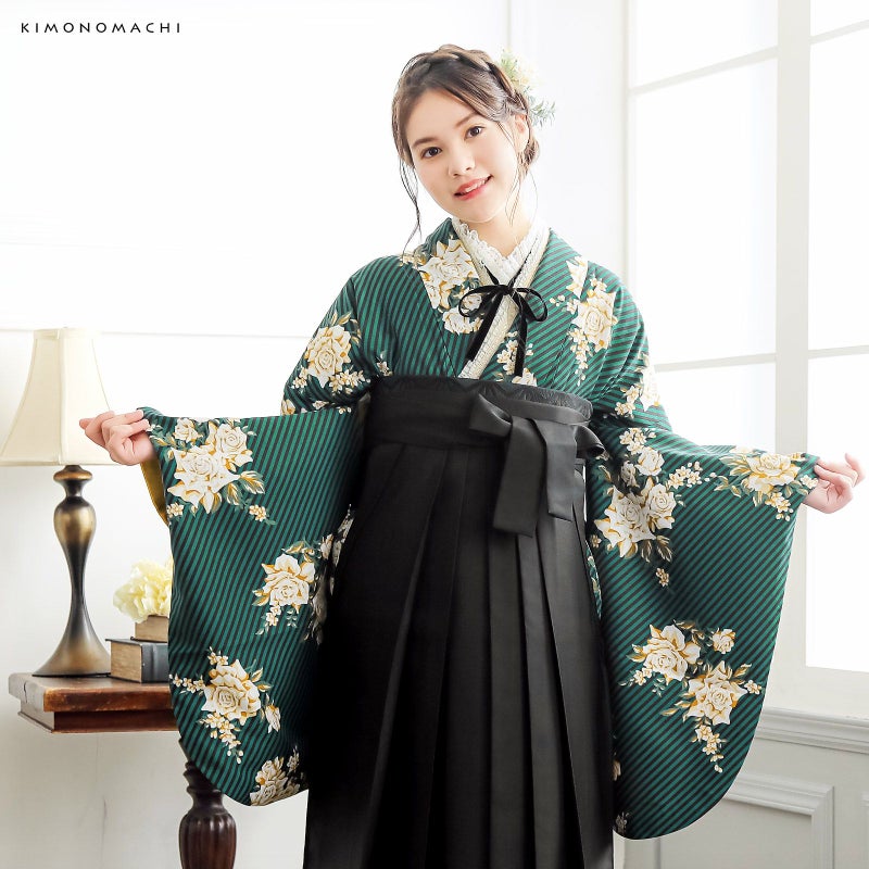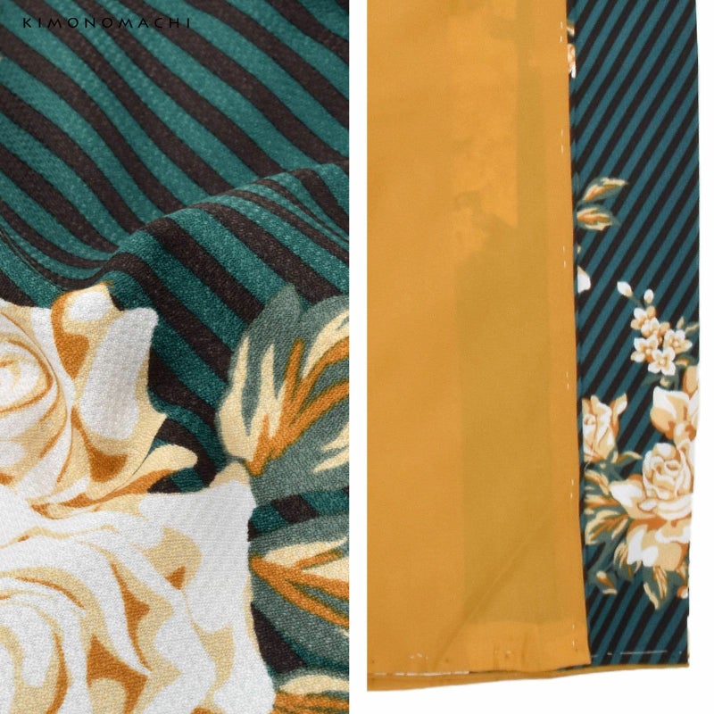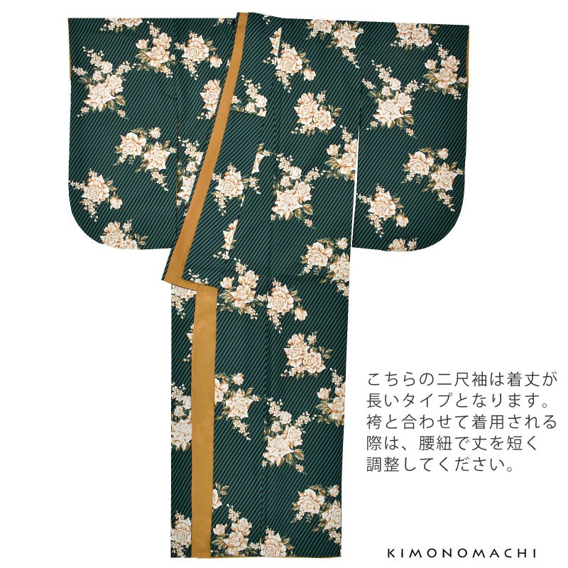 二尺袖着物:細かな地模様のある生地。青みの深緑に黒の斜めストライプの地、白にベージュ、キャメルのバラのブーケが飛び柄で表現されたスタイリッシュなデザイン。裏地は山吹茶。
