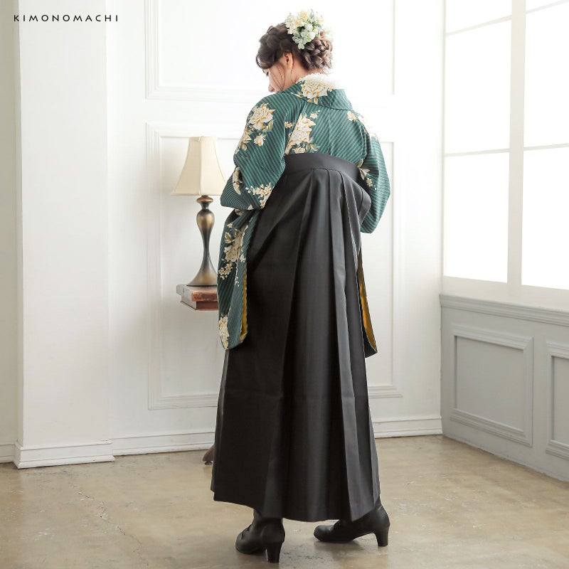 袴はシンプルな単色。行灯袴(あんどんはかま)で中仕切りのないスカートタイプ。草履はもちろん、ブーツを合わせたモダンな着こなしにも。生地はお手入れしやすいポリエステル素材です。