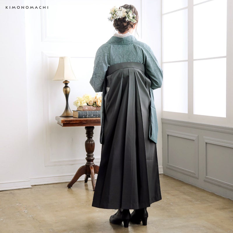 袴は、グラデーションが綺麗な行灯袴(あんどんはかま)で中仕切りのないスカートタイプ。草履はもちろん、ブーツを合わせたモダンな着こなしにも。生地はお手入れしやすいポリエステル素材です。