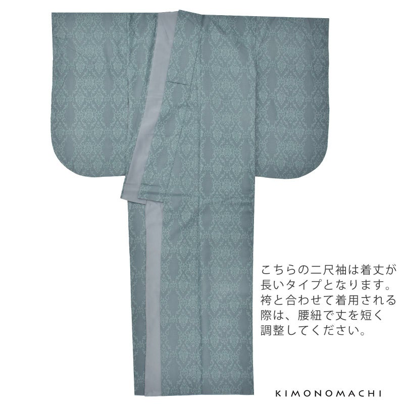二尺袖着物:細かな地模様のある生地。青緑みのグレーの地にグレイッシュな水色のアラベスク文様。菱形の唐花に立涌状に伸びる蔓草文様とターコイズ系のブルーグレーが、オリエンタルな優美さを感じさせるデザインです。裏地はグレー。