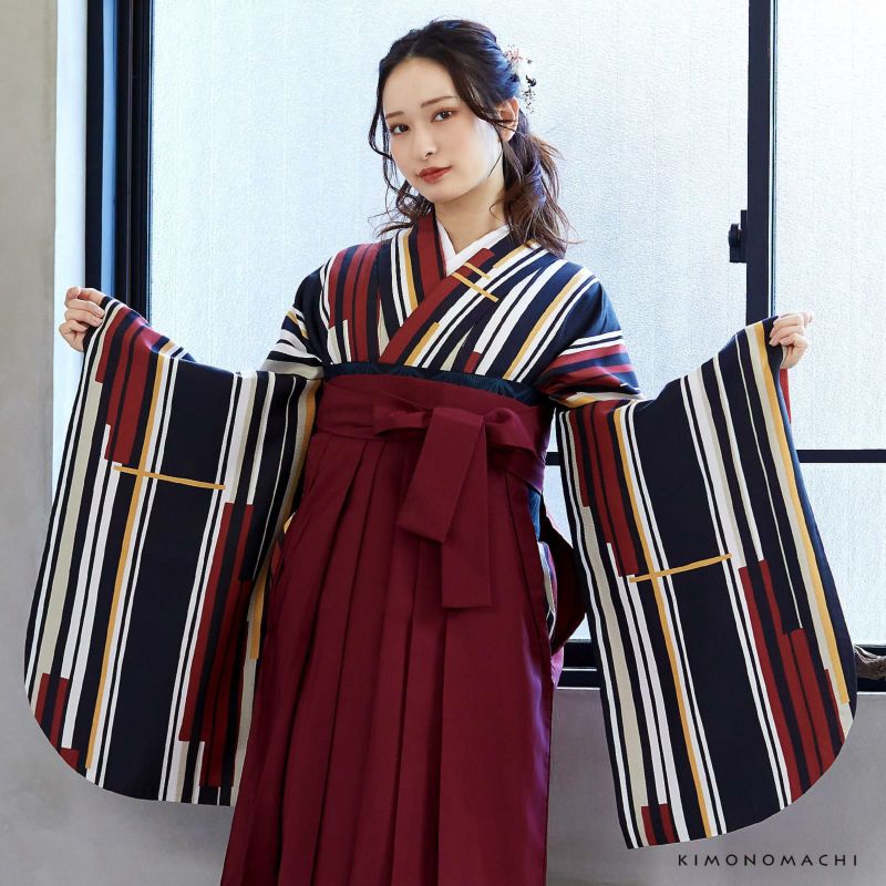 袴 セット 卒業式 女性 4点セット「二尺袖:ラインカラー 黄色×薄香+袴:エンジ+袴下帯:黒 麻の葉+襦袢」卒業式 女性 レディース お仕立て上がり 袴セット 二尺袖着物セット 着物 二尺着物 袴