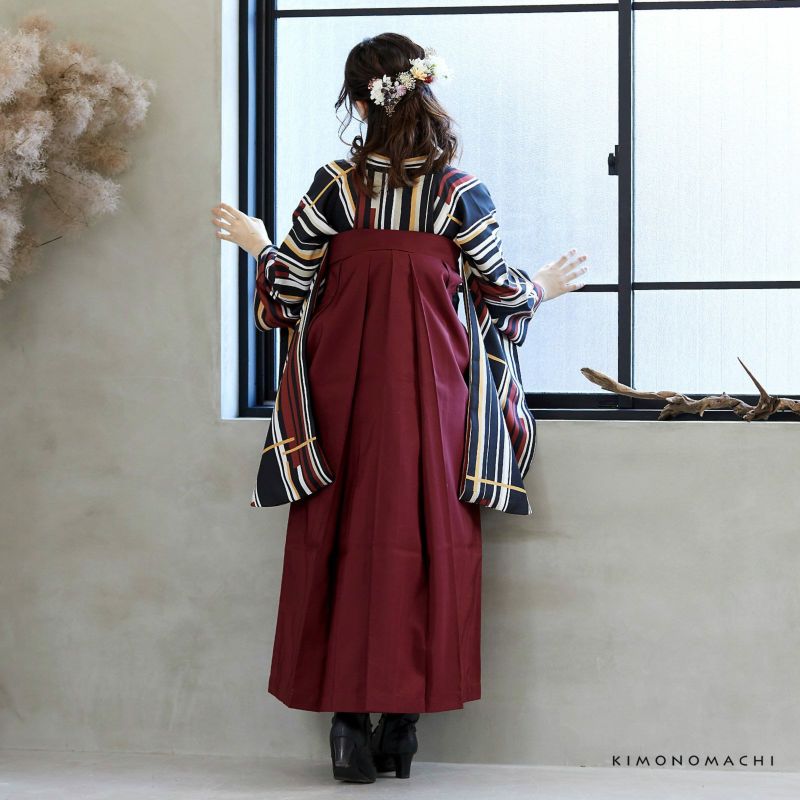 袴はシンプルな単色。行灯袴(あんどんはかま)で中仕切りのないスカートタイプ。草履はもちろん、ブーツを合わせたモダンな着こなしにも。生地はお手入れしやすいポリエステル素材です。