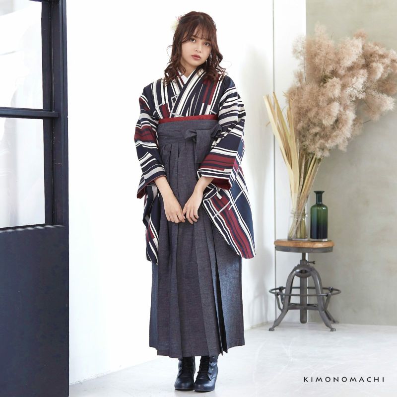 袴 セット 卒業式 女性 4点セット「二尺袖:ラインカラー 灰色×赤+袴:デニム  ブラック+袴下帯:レッド 麻の葉+襦袢」卒業式 女性 レディース お仕立て上がり 袴セット 二尺袖着物セット 着物 二尺着物 袴【メール便不可】