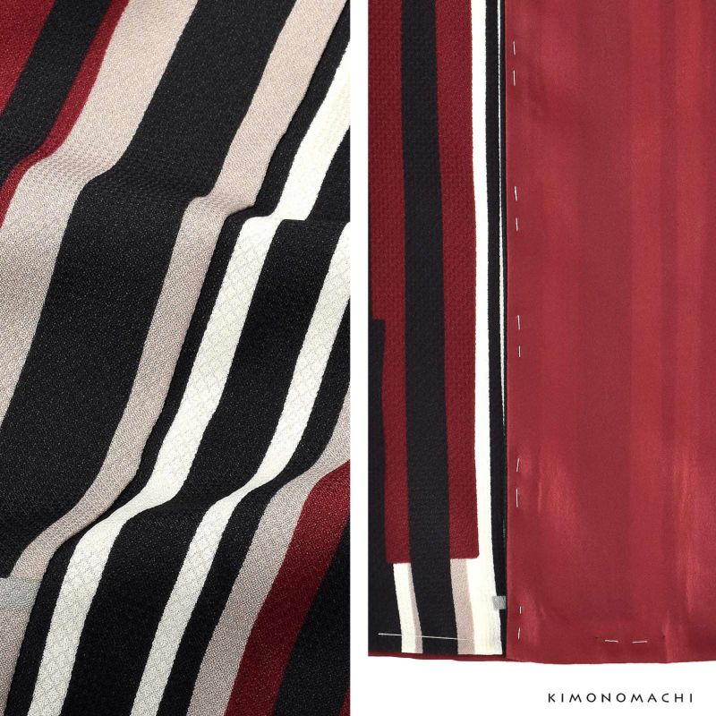 二尺袖着物:細かな地模様のある生地。黒をメインに、白、深い紅色にグレー、やや赤みのグレージュのランダムな縞。ところどころグレーのラインが横切るデザイン。スタイリッシュな格好良さとレトロな雰囲気を併せ持っています。裏地は臙脂。