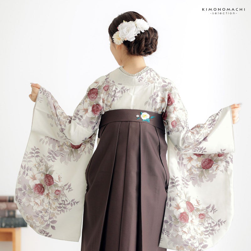 卒業式に 二尺袖袴セット 卒業式 袴 レディース 袴 セット 卒業式 女性 4点セット「二尺袖:ブーケ オフホワイト+袴:アンティークブラウン 椿の刺繍+袴下帯:白 麻の葉+襦袢」卒業式 女性 レディース お仕立て上がり 袴セット 二尺袖着物セット 着物 二尺着物 袴【メール便不可】