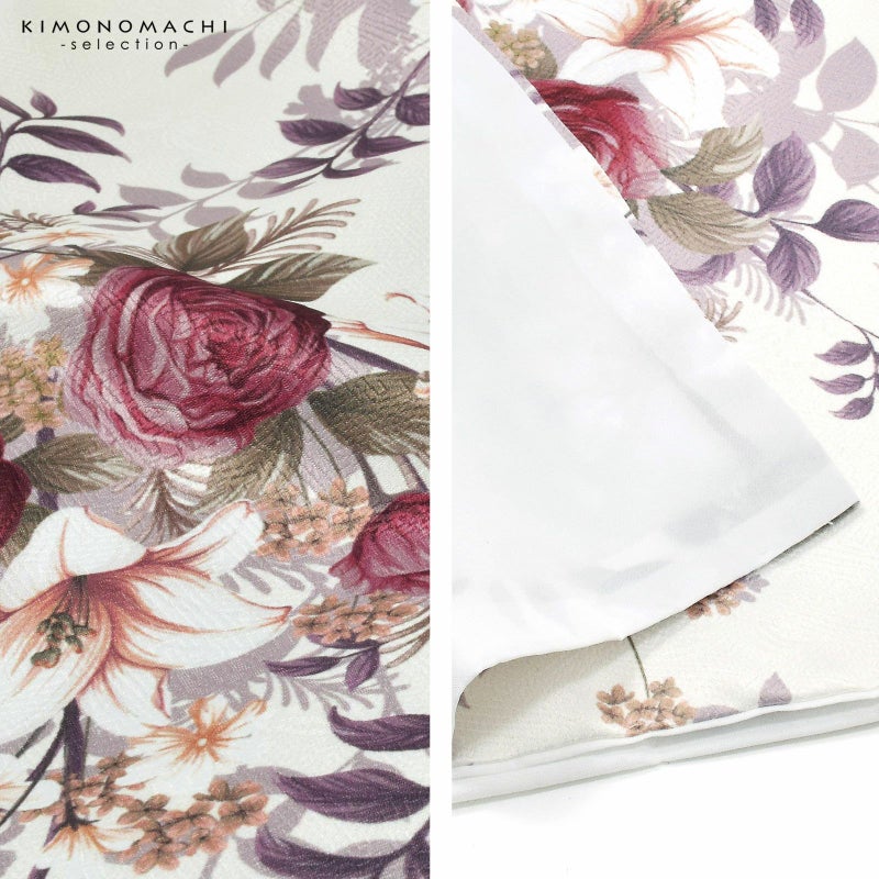 二尺袖着物:紗綾形に花の地模様の生地。オフホワイトの地に、エンジ色や白、黄土色、灰紫色のバラや百合、小花に葉のブーケ。浅い赤茶の影や、パープルグレー色のシルエットが奥行きを添えています。