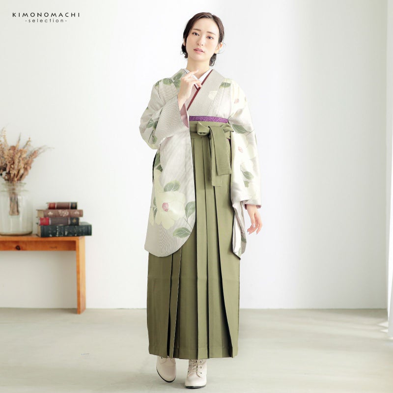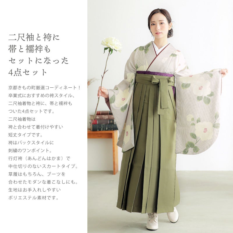 袴 セット 卒業式 女性 4点セット「二尺袖:縞に椿 グレーベージュ+袴:オリーブ 南天+袴下帯:グレープ 麻の葉+襦袢」卒業式 女性 レディース お仕立て上がり 袴セット 二尺袖着物セット 着物 二尺着物 袴
