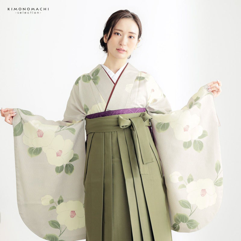 袴 セット 卒業式 女性 4点セット「二尺袖:縞に椿 グレーベージュ+袴:オリーブ 南天+袴下帯:グレープ 麻の葉+襦袢」卒業式 女性 レディース お仕立て上がり 袴セット 二尺袖着物セット 着物 二尺着物 袴【メール便不可】