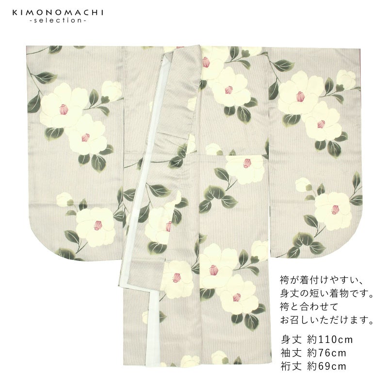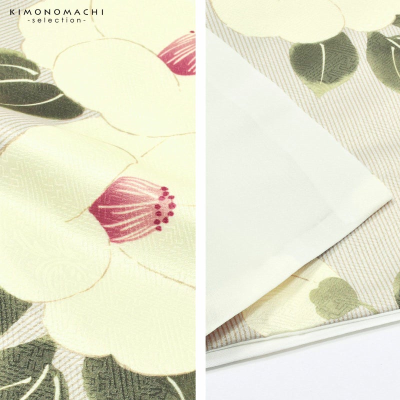 二尺袖着物:紗綾形に花の地模様の生地。グレーにグレーベージュの細かな縞の地、オフホワイトの花びらに浅い赤紫色の蕊の椿の花。抹茶色の濃淡で表現された枝葉。
