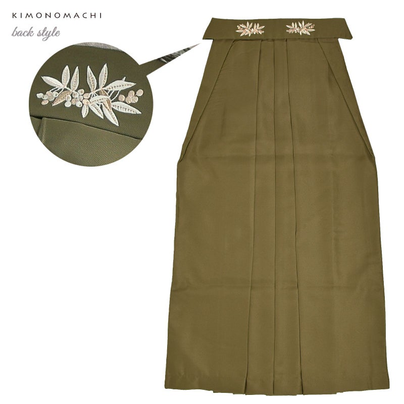 袴:灰みの黄緑色系のオリーブ色の地、腰の後ろ部分にシルバーグレーやグレージュ、ポイントに金糸の入った南天の刺繍。