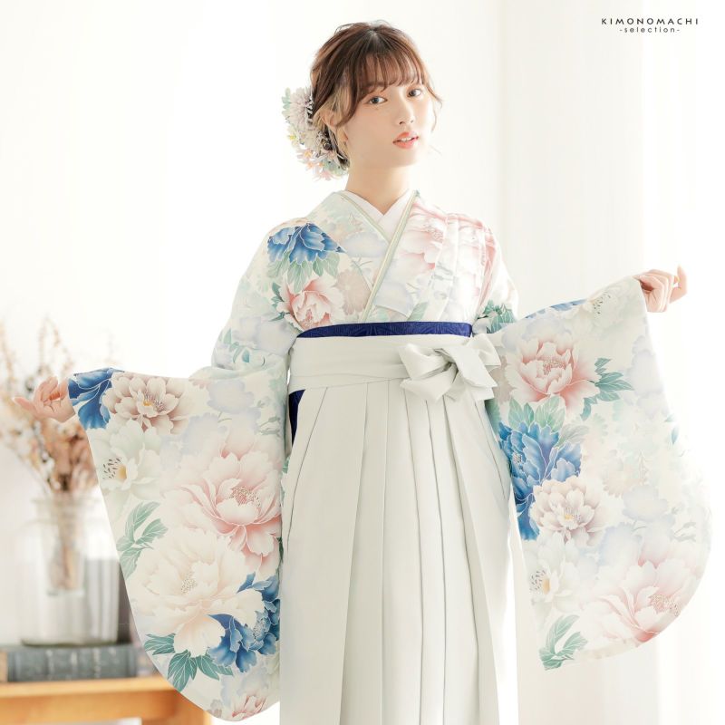 袴 セット 卒業式 女性 4点セット「二尺袖:オフホワイト 牡丹に花々+袴:アイスグレー 椿の刺繍+袴下帯:ネイビー 麻の葉+襦袢」卒業式 女性 レディース お仕立て上がり 袴セット 二尺袖着物セット 着物 二尺着物 袴【メール便不可】