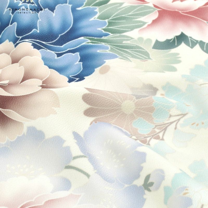 二尺袖着物:オフホワイトの地。白に淡いベージュのぼかし、浅い赤紫、ネイビーのぼかしの大輪の牡丹の花。深緑色の葉。淡い緑やベージュ、水色などの桜や藤、菊の花々が合間を埋め尽くすように表現されています。