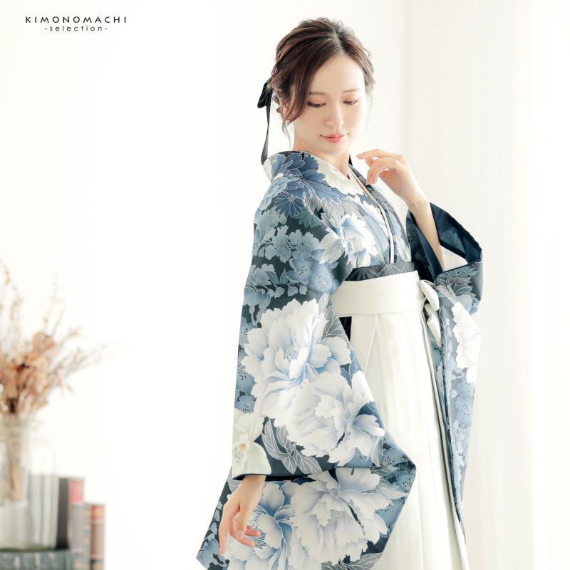 卒業式に 二尺袖袴セット 卒業式 袴 レディース 袴 セット 卒業式 女性 4点セット「二尺袖:藍鉄色 牡丹に花々+袴:アイスグレー 椿の刺繍+袴下帯:ブラック 麻の葉+襦袢」卒業式 女性 レディース お仕立て上がり 袴セット 二尺袖着物セット 着物 二尺着物 袴【メール便不可】
