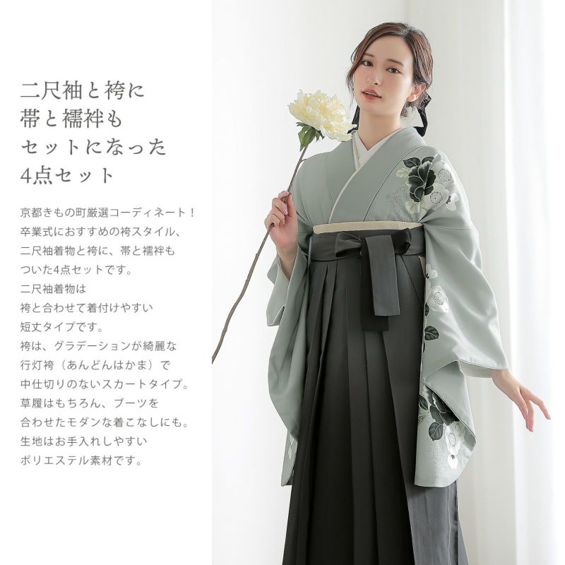 袴 セット 卒業式 女性 4点セット「二尺袖:グレー 椿に梅+袴:黒色ぼかし+袴下帯:ウォームグレー 麻の葉+襦袢」卒業式 女性 レディース お仕立て上がり 袴セット 二尺袖着物セット 着物 二尺着物 袴