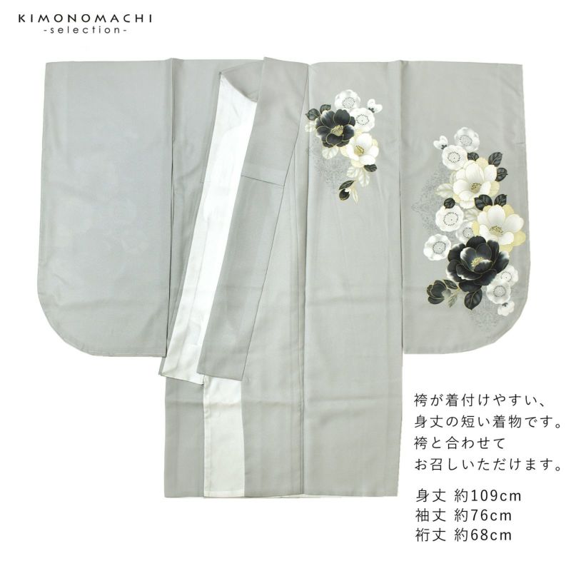 卒業式に 二尺袖袴セット 卒業式 袴 レディース 袴 セット 卒業式 女性 4点セット「二尺袖:グレー 椿に梅+袴:黒色ぼかし+袴下帯:ウォームグレー 麻の葉+襦袢」卒業式 女性 レディース お仕立て上がり 袴セット 二尺袖着物セット 着物 二尺着物 袴【メール便不可】