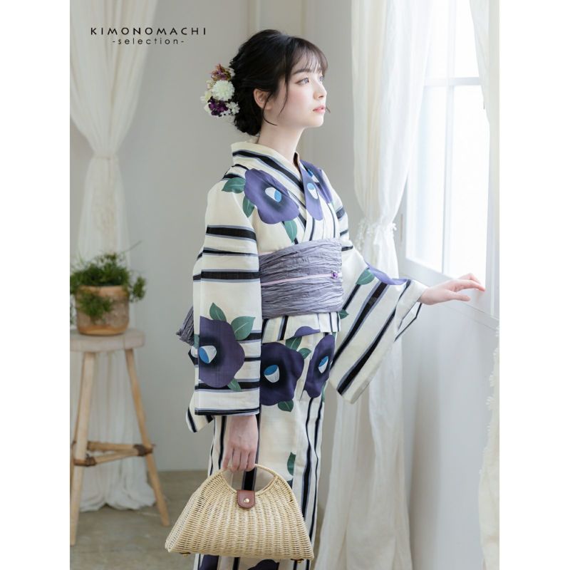 5. 浴衣 レディース 女性浴衣単品 「スイートリリー:薄クリーム地×紫墨 よろけ縞に椿」Fサイズ 綿浴衣 プレタ浴衣 お仕立て上がり浴衣 ブランド浴衣 大人浴衣 女性用 女性浴衣 ゆかた【メール便不可】