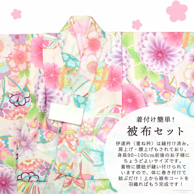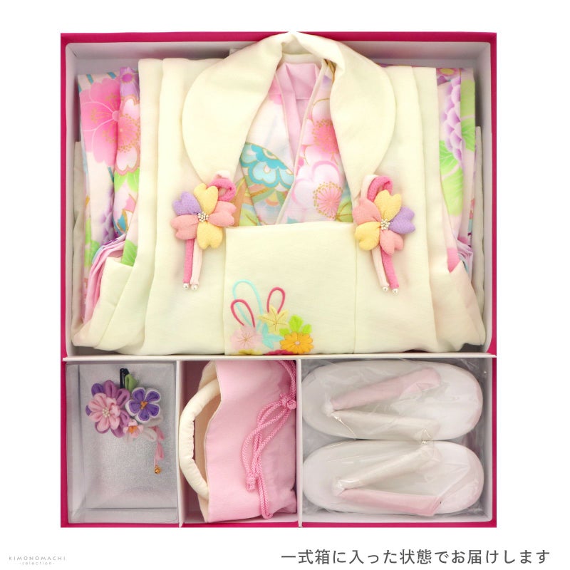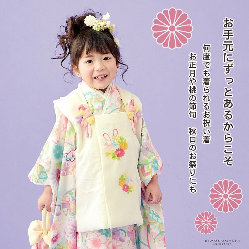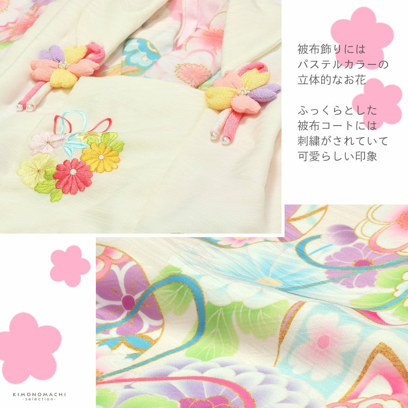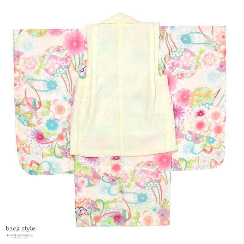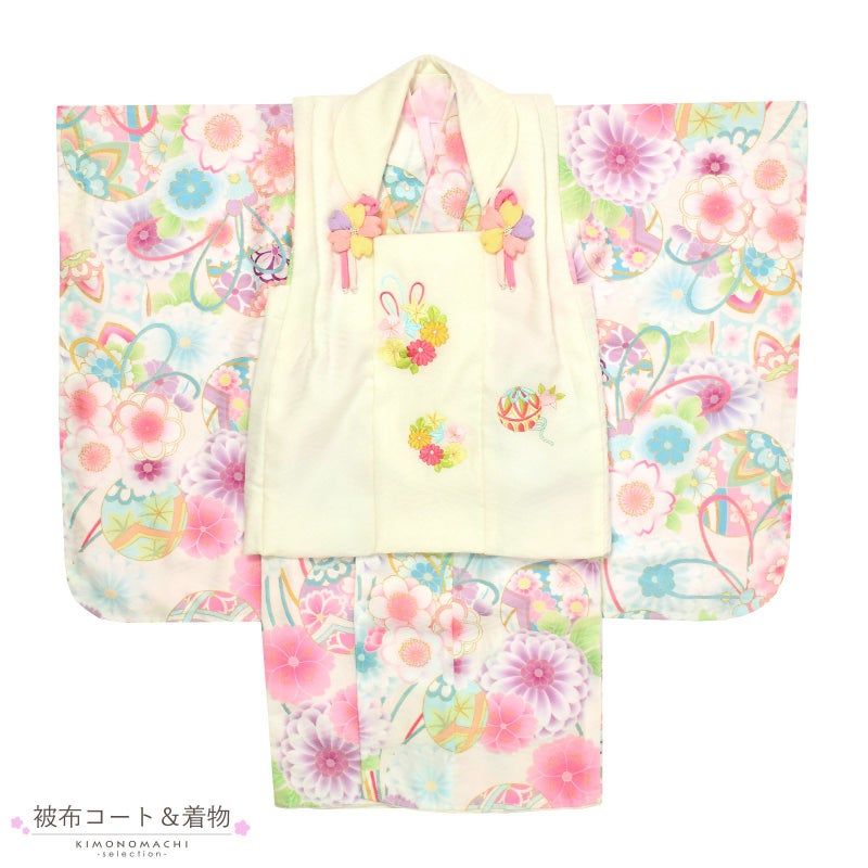 3. 七五三 着物 3歳 女の子 ブランド被布セット Shikibu Roman 式部浪漫「アイボリー アイボリー 花くす玉に桜、鞠」三歳女児被布セット 子供着物 フルセット 三才のお祝い着 3才向け【メール便不可】