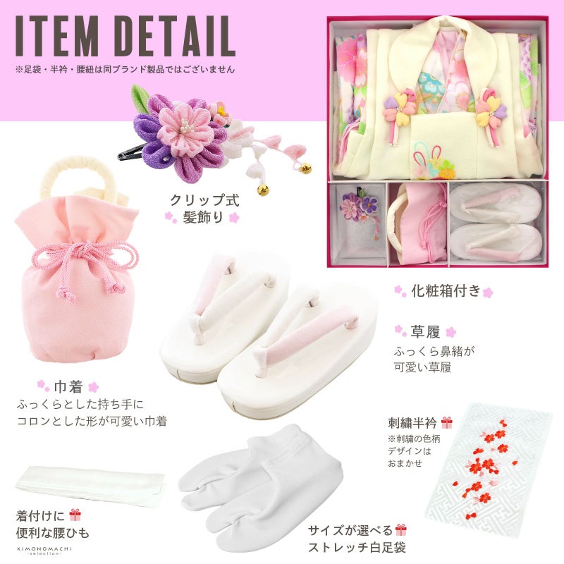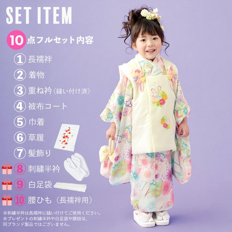 【商品内容】長襦袢・着物・重ね衿(縫い付け済)・被布コート・巾着・草履・髪飾り・刺繍半襟(プレゼント)・足袋(プレゼント)・腰ひも1本(プレゼント)の計10点