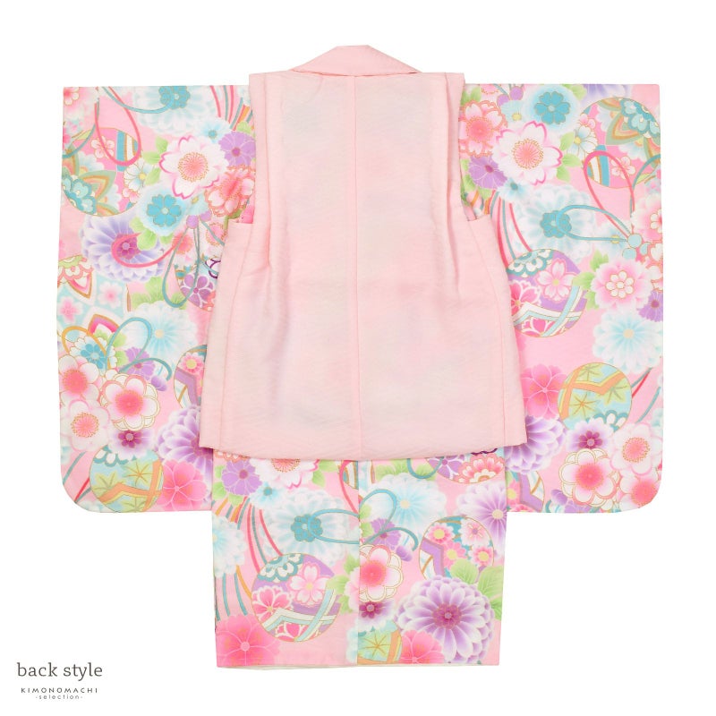【色柄】被布コートは淡いピンク色の地にピンクや水色、薄黄色の薬玉や花の丸の刺繍。薄ピンクや黄色のつまみの桜の被布飾り。着物は紗綾形の地模様のある明るい薄ピンク地に淡い水色やピンクの花紋、水色や黄色、濃いピンクの紐の付いた花くす玉。薄紫色、水色を基調とした手鞠など。重ね衿はアイボリー。薄ピンクの長襦袢。草履は白の台に薄ピンクと白の片ぼかしの鼻緒。巾着は淡いピンクの袋にアイボリーの見返しと持ち手。紫色やピンク、白のつまみのお花の髪飾り。
