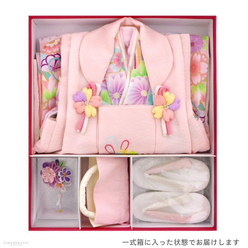 【商品内容】長襦袢・着物・重ね衿(縫い付け済)・被布コート・巾着・草履・髪飾り・刺繍半襟(プレゼント)・足袋(プレゼント)・腰ひも1本(プレゼント)の計10点