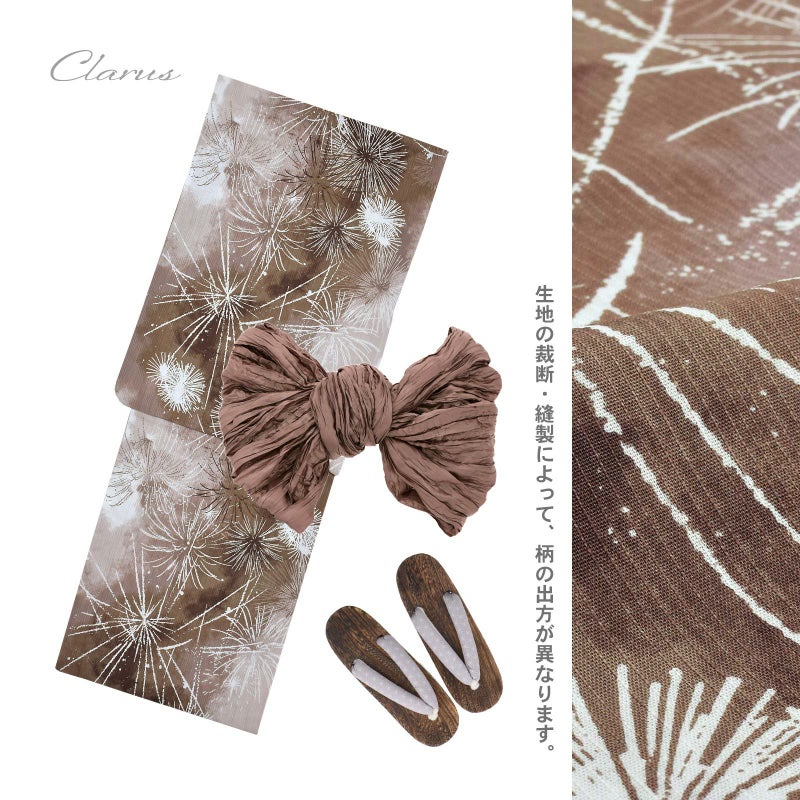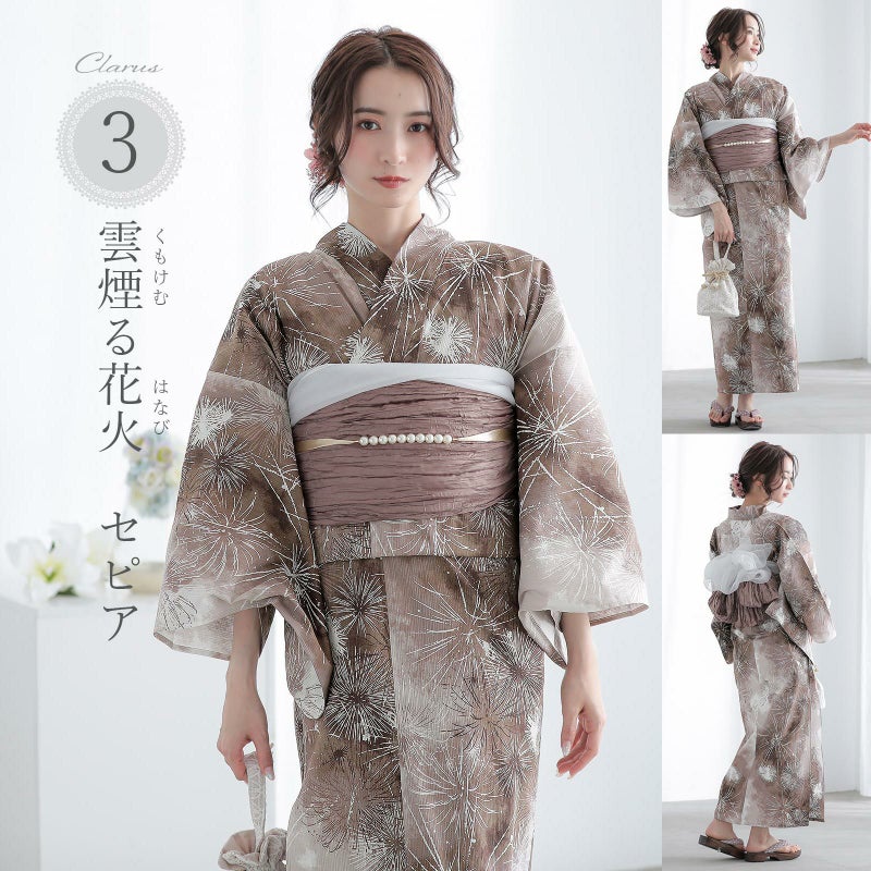 浴衣:淡いトープベージュや濃淡のあるセピアの流れ。白や濃いブラウン、アンバーの線で表現された花火。たくさんの思い出の中の花火をすべて浴衣に閉じ込めたようなデザインです。