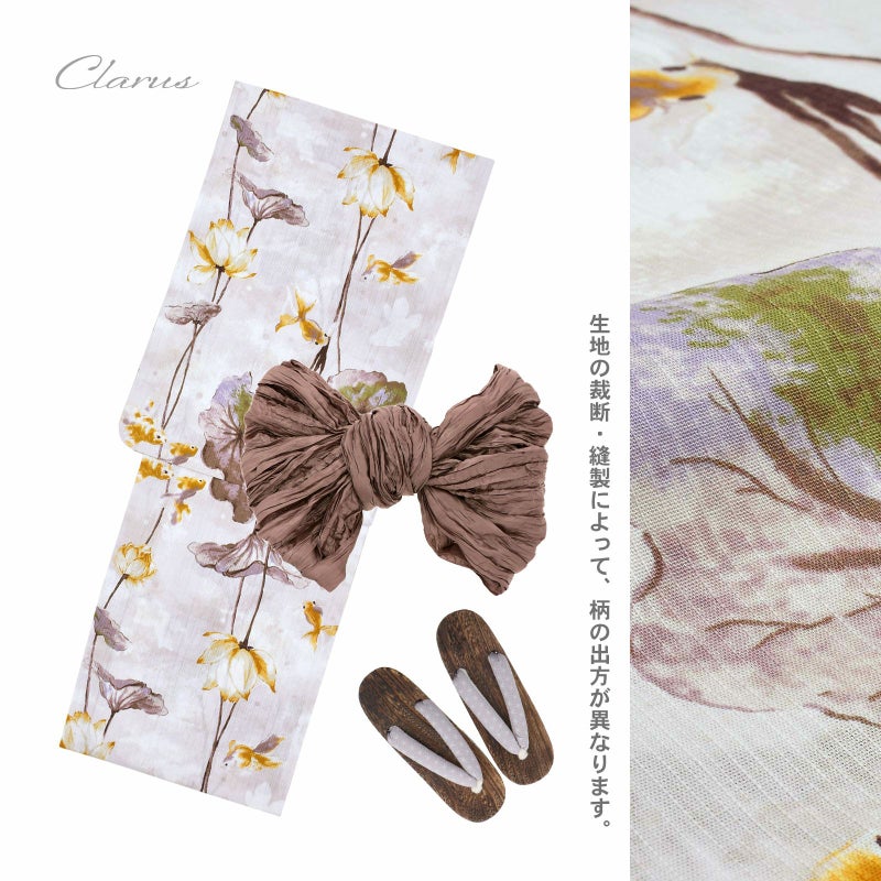 浴衣:白地にごく淡いトープベージュのぼかし。水彩調の蓮は、セピアにパープルグレー、黄緑の挿し色の入った葉、長く伸びた茎の先にからし色や金茶色に色づいた花、ベージュの影。金魚がふわふわと浮かび泳ぎ、古い伝承の世界のような不思議で懐かしい雰囲気です。