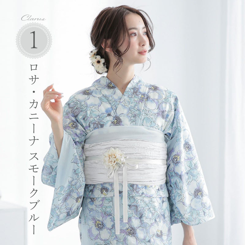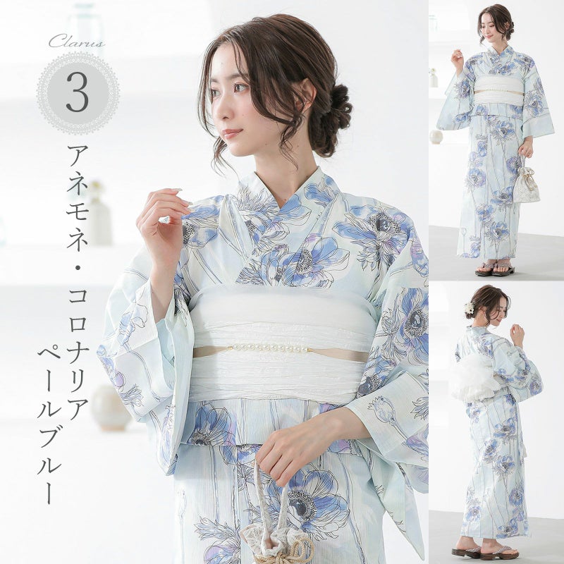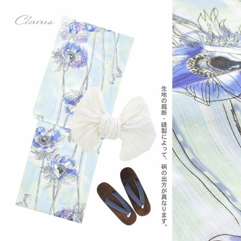 5. Clarus レディース 女性浴衣3点セット(浴衣+しわ兵児帯+下駄)「植物図鑑 ブルー系(寒色系)ロサ・カニーナ/パパウェル・ロエアス/アネモネ・コロナリア/マルチフローラ」F/フリーサイズ 綿浴衣 大人可愛い きもの町オリジナル 女性用浴衣 ゆかた yukata【メール便不可】