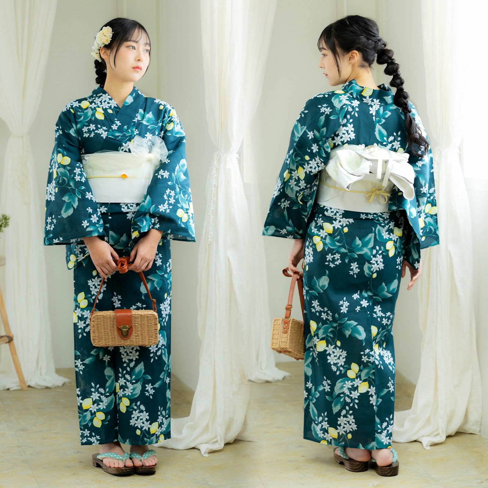 浴衣:暗めの青緑色の地に、花や実をつけたレモンの柄。浅い青緑と白緑色のぼかしの葉。白と淡いグレーの花。明るい黄色、白のつややかな実。レモンの瑞々しさを感じさせるデザインが、新鮮な魅力を放ちます。