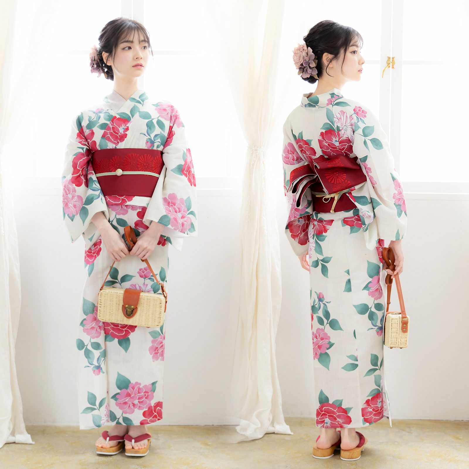 浴衣:アイボリーの地にピンク色と濃ピンク色、赤みのピンク色、白にピンク色の絞りの入った椿の花。青磁色と緑の葉。ところどころかすれたような色合いと、輪郭線のない表現がレトロでかわいらしい雰囲気です。