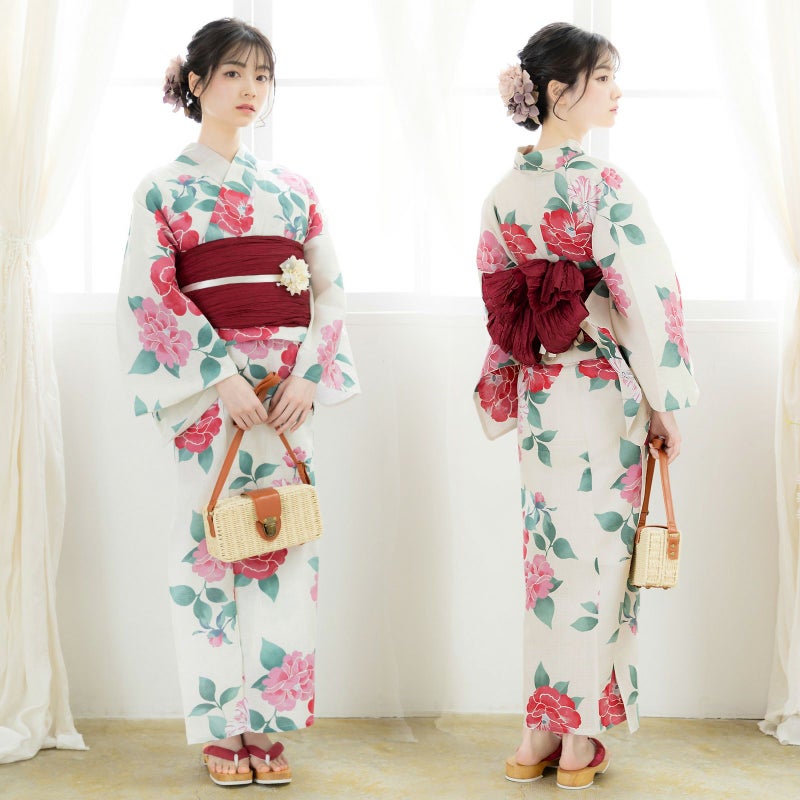 浴衣:アイボリーの地にピンク色と濃ピンク色、赤みのピンク色、白にピンク色の絞りの入った椿の花。青磁色と緑の葉。ところどころかすれたような色合いと、輪郭線のない表現がレトロでかわいらしい雰囲気です。