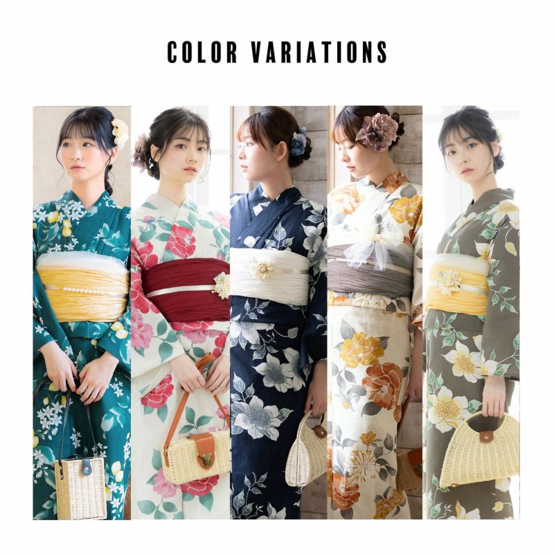 浴衣:暗めの青緑色の地に、花や実をつけたレモンの柄。浅い青緑と白緑色のぼかしの葉。白と淡いグレーの花。明るい黄色、白のつややかな実。レモンの瑞々しさを感じさせるデザインが、新鮮な魅力を放ちます。