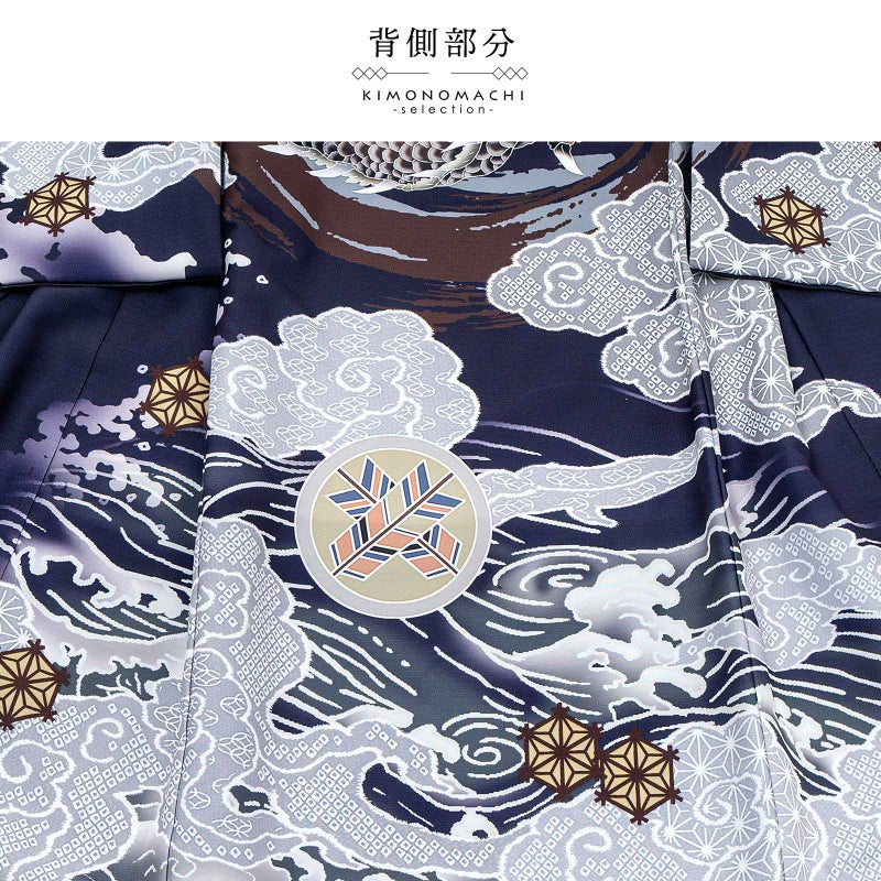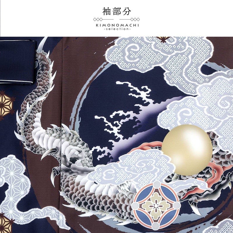 【色柄】着物はグレイッシュな青紫みの紺色地にブルーグレーの裾ぼかし。背には茶色と青灰色の円相。その上に白に墨色、赤茶の龍。角やひげの金銀の刺繍が勇壮な煌びやかさを添えます。吉祥紋を詰めたグレーの雲。宝尽くしの丸紋や結晶のような形の麻の葉紋。襦袢は地紋のある白。袖の振りは淡い水色。