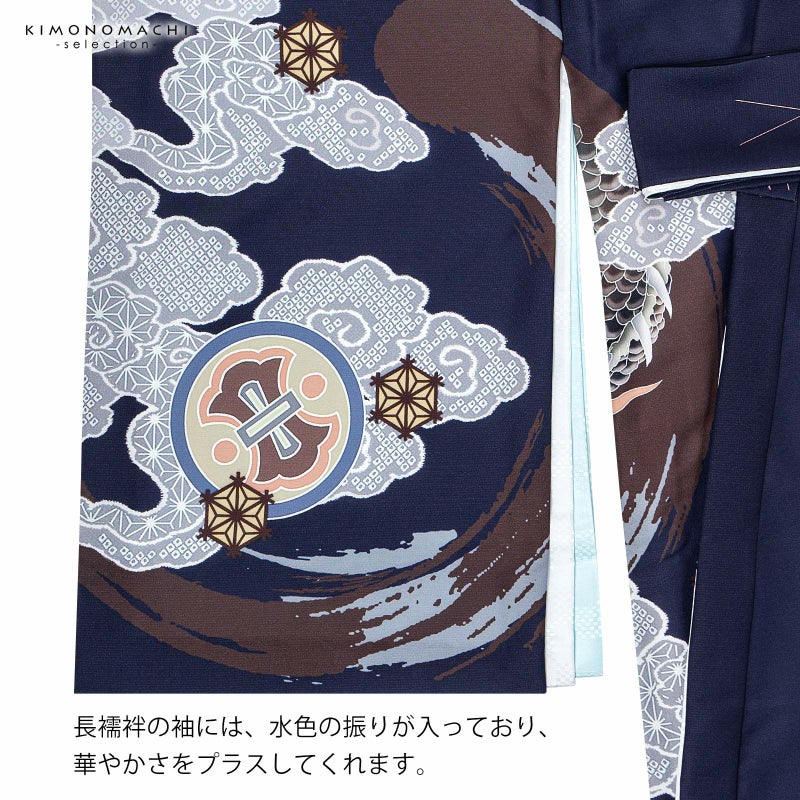 男の子らしく勇ましい、カッコイイ雰囲気。美しい発色の生地に美しい模様。長襦袢の中に水色の振りが入っており、お洒落な雰囲気をプラスしてくれます。