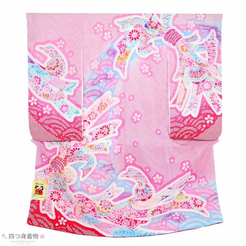 着物は、地模様のある生地を、上は青みピンク、裾にかけて濃いピンクや藤色のぼかしに白の疋田に染め上げた地。背や上前の束ね熨斗は藤色、水色、紅紫、薄緑色、橙色などで表現された花紋や吉祥文様が詰められています。その上に手鞠やお花。上前の熨斗の結び目には金駒刺繍。絞りのやわらかな表現と豊かな色彩が上品で洗練された印象です。黄緑と山吹色の重ね衿。襦袢は薄ピンクの鶴に亀甲の地紋。