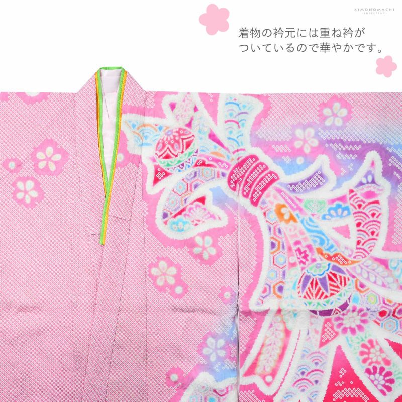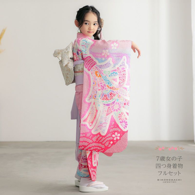 七歳の七五三(四つ身着物)の着付けに必要なものが揃ったフルセットです。お洒落で女の子らしい雰囲気。