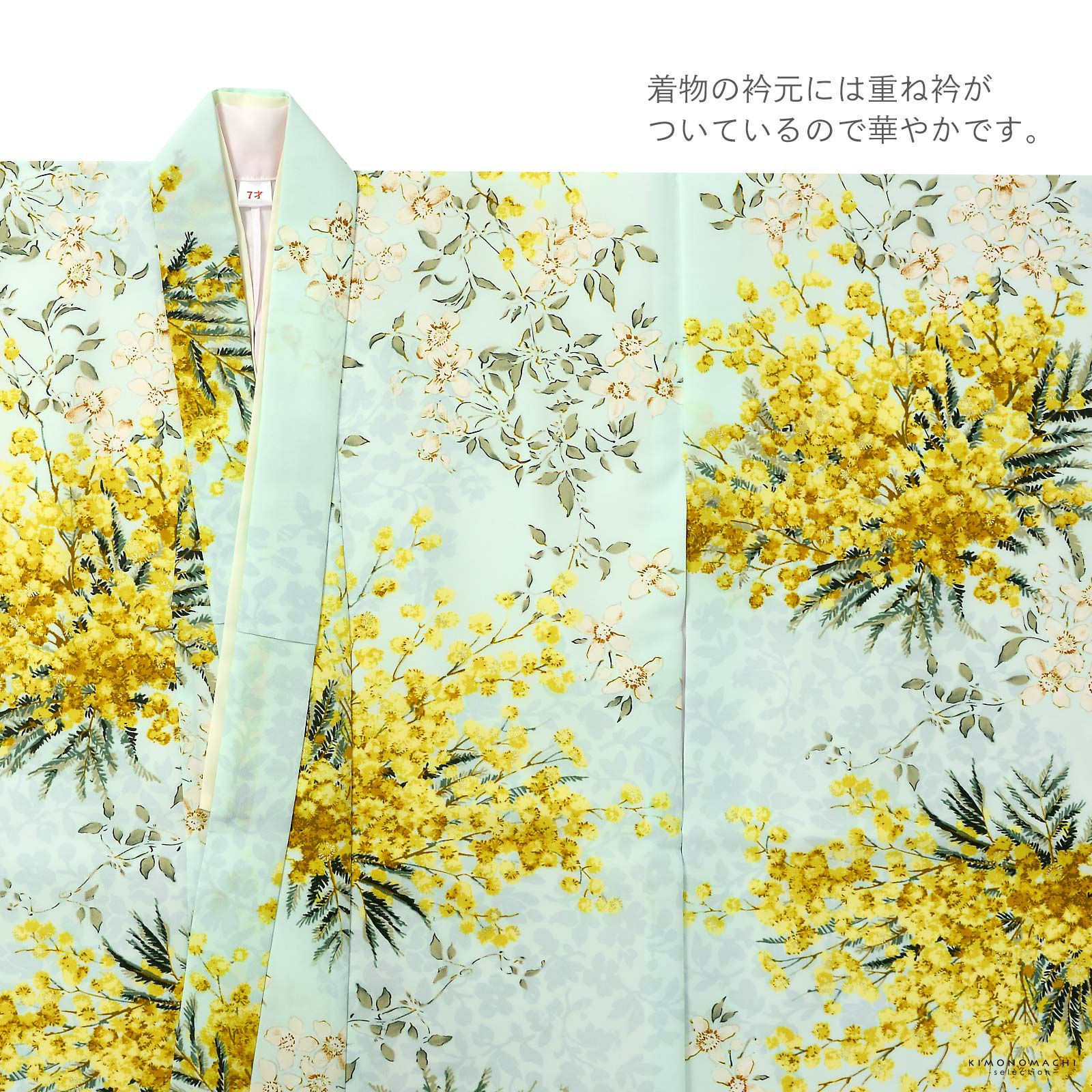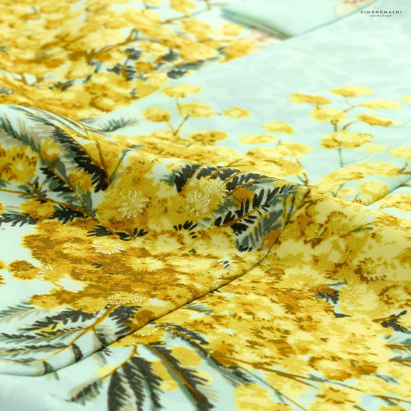 着物はややグレイッシュなごく淡い水色の地に薄水色のお花のシルエット。陰影のある黄色のミモザの花に深緑の葉、白い小花。