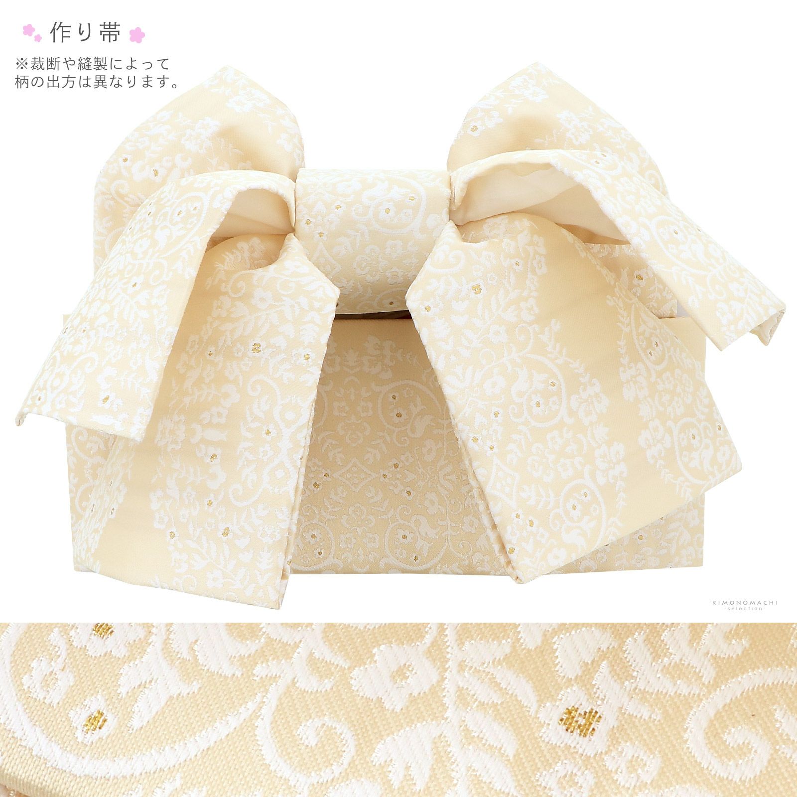 帯はエクルベージュの地に、白で織り出されたレースのような唐草文様。ポイントにゴールド。
