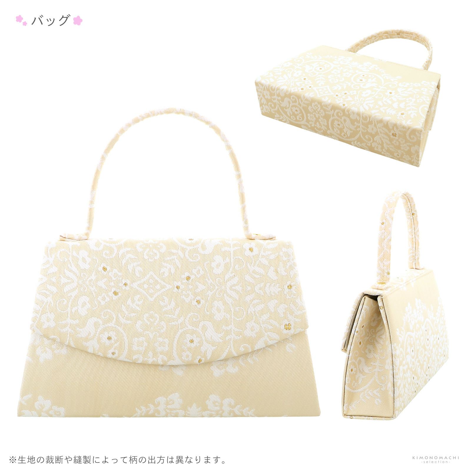 バッグはエクルベージュの地に、白で織り出されたレースのような唐草文様。ポイントにゴールド。草履の鼻緒と台はバッグと共生地、鼻緒の裏地と前坪はアイボリー。