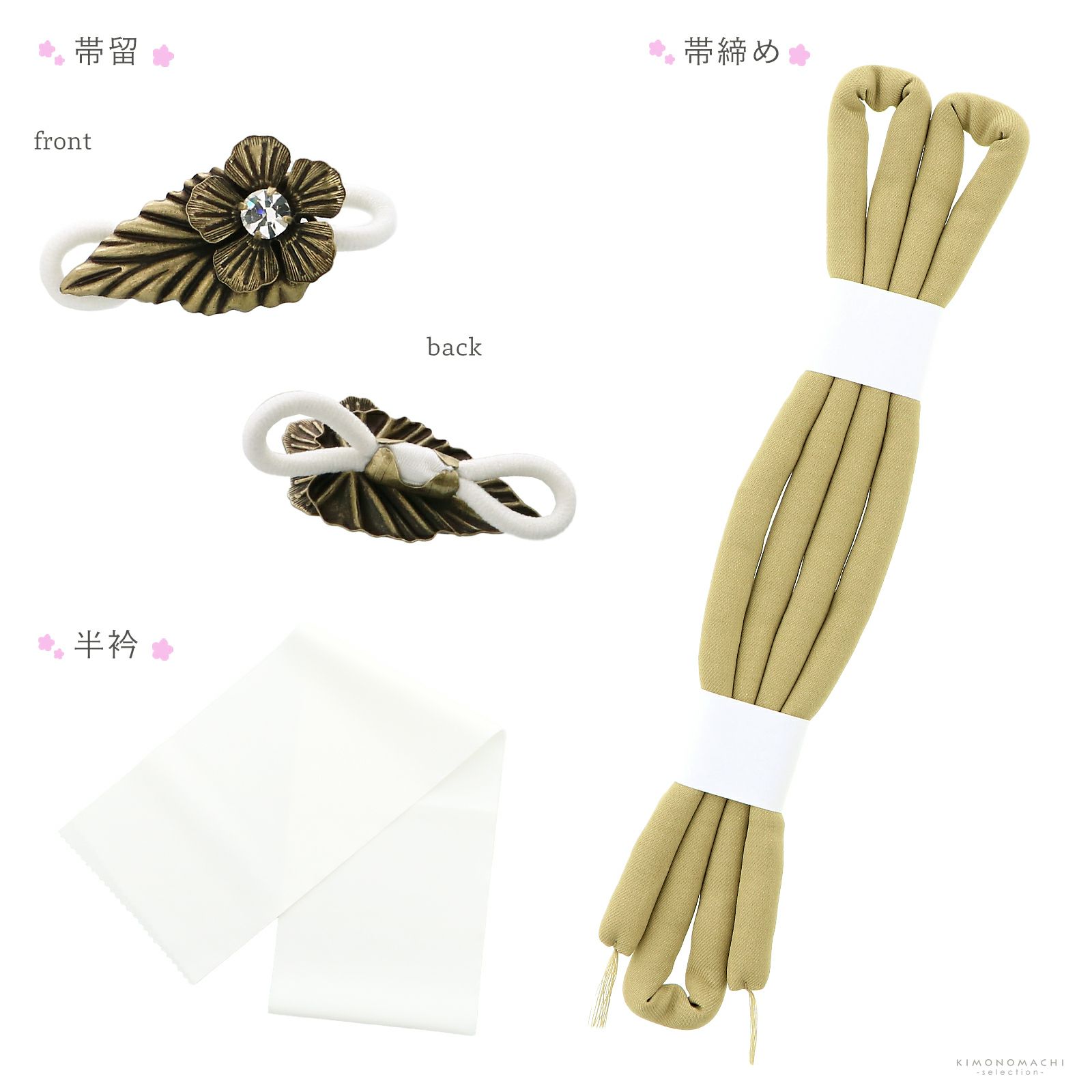 【商品内容】長襦袢・着物・重ね衿(縫い付け済)・結び帯・しごき・帯揚げ・帯締め・帯留・箱迫・びらかん・扇子(末広)・半衿・草履・バッグ・腰ひも3本(プレゼント)・足袋(プレゼント)の計16点
