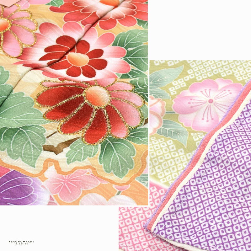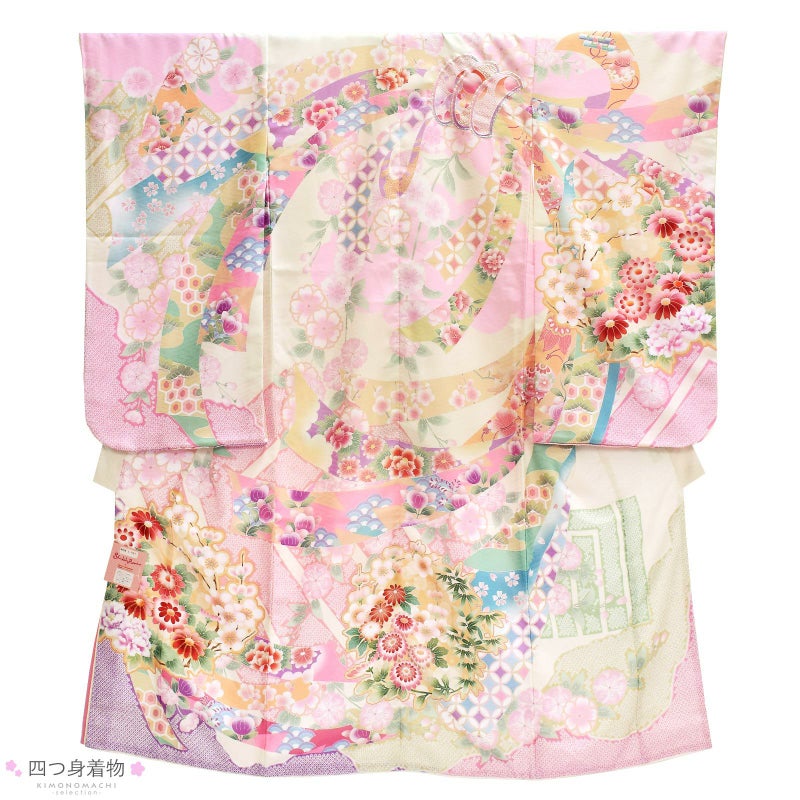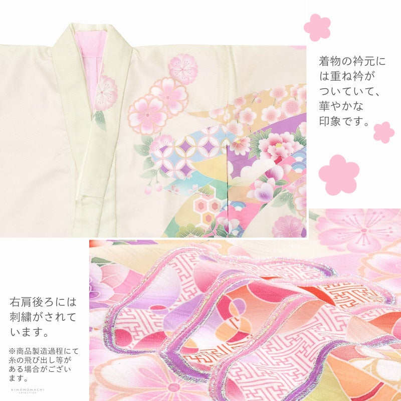 着物はアイボリーの地に紗綾形の地模様。淡い桃色や藤色、抹茶色の鹿の子の雲取りや源氏香。背には淡いベージュや藤色、黄緑に吉祥文様を詰めた束ね熨斗。やわらかいピンク、緑、橙、朱色など桜や菊、梅などの四季の花。ポイントに金糸やラメ糸の刺繍。褄下に藤色、桃色、オフホワイトの比翼風の飾り布。重ね衿はオフホワイト。