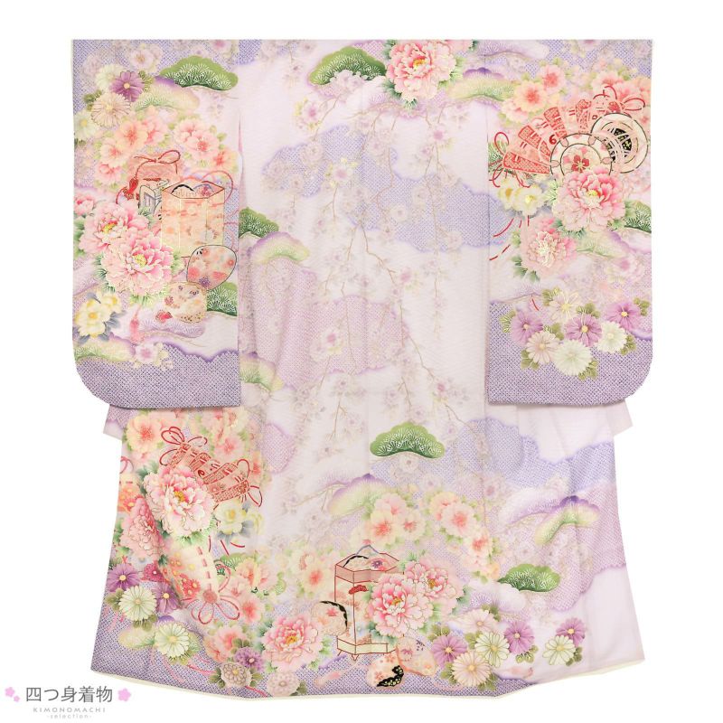 着物:紗綾形の地模様、ややグレイッシュなごく淡い藤色の地。薄紫や青紫色の道長取りに疋田文様。アイボリーに淡いピンクや抹茶色、薄紫を基調とした檜扇に貝桶、御所車、鼓や源氏車などの王朝風の文様。さらに牡丹に八重桜、松、椿、梅、菊などの四季の花が柔らかい色彩で表現されています。ポイントに金彩。重ね衿は淡いアイボリー。長襦袢はごく淡いピンク。
