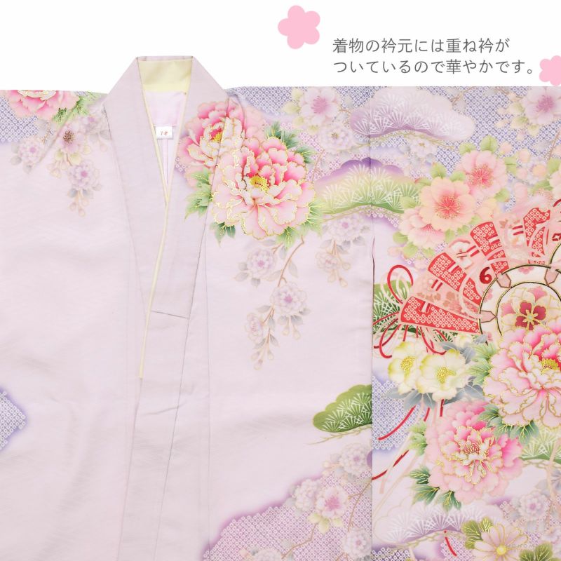 七歳の七五三(四つ身着物)の着付けに必要なものが揃ったフルセットです。お洒落で女の子らしい雰囲気。衿元も重ね衿がついているので華やかです。