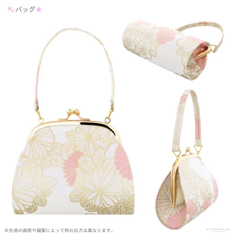 草履・バッグ:紗綾形の地模様、ややグレイッシュな水色の地。淡い青や鶸色の道長取りに疋田文様。アイボリーに淡いピンクや薄緑、浅葱色を基調とした檜扇に貝桶、御所車、鼓や源氏車などの王朝風の文様。さらに牡丹に八重桜、松、椿、梅、菊などの四季の花が柔らかい色彩で表現されています。ポイントに金彩。