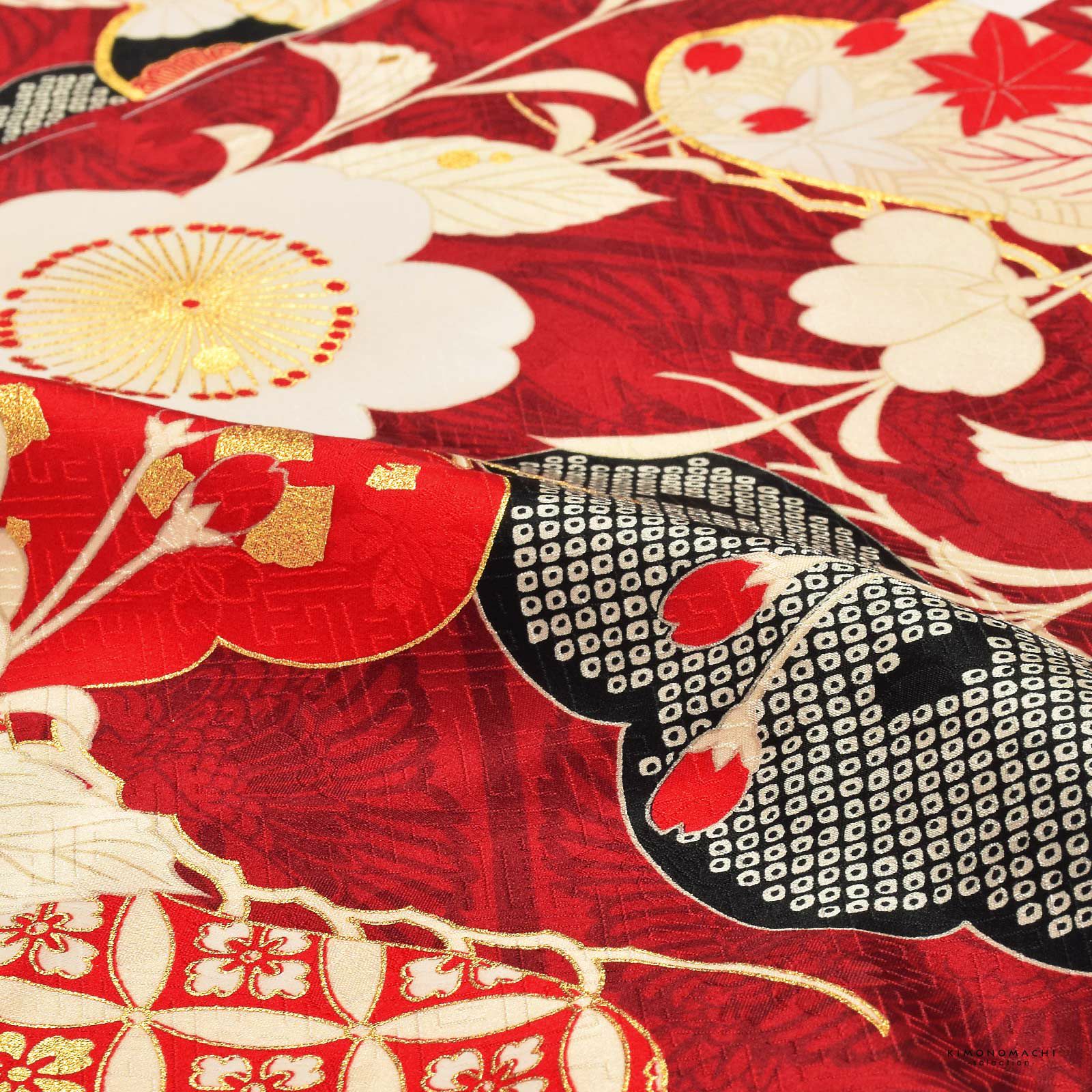 着物:紗綾形に花の地模様のある生地。深い赤色の地に、赤銅色で菱に向かい鶴文様が全体に表現されています。朱赤や黒色、アイボリーの松紋の中に鹿の子や七宝、青海波、花紋などの文様。オフホワイトの枝垂れの裏桜の上に、金と朱赤の蕊のある白い細川桜紋が散らされ、深緑の葉がアクセントを添えています。ポイントに金彩。重ね衿はアイボリー。長襦袢はごく淡いピンク。