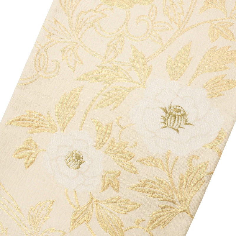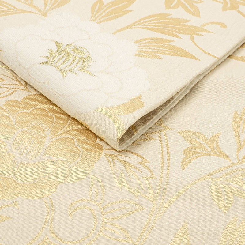 【色柄】地の色は淡い生成り色。ふくれ織り調の立体感のある立涌の地に、白と金色で表現された牡丹唐草の文様。